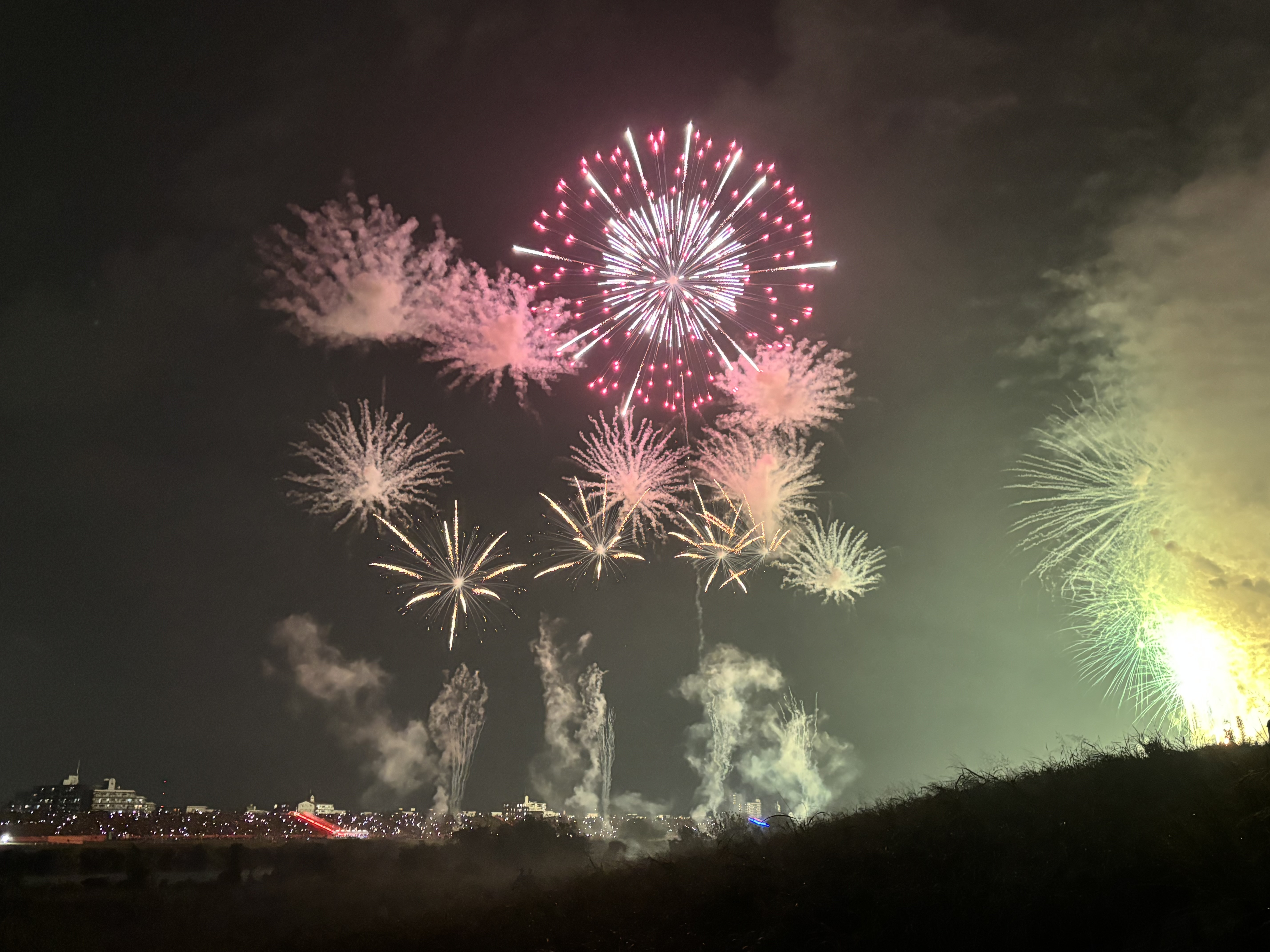 風があんまり吹いてなくて、花火の煙すごかったけど、合間から見えた花火綺麗だったよー。